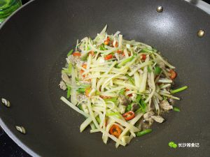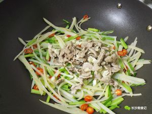 将廋肉放入,加入适量食盐,继续炒约1分钟;