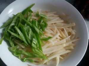 土豆 辣椒洗净 切成丝,注意土豆用凉水泡一下