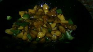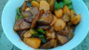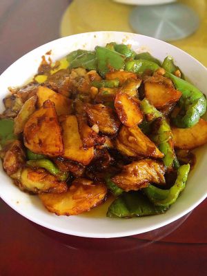 都炸好后,把油倒出来,留底油。爆香3分之2蒜沫,放入土豆片茄子,翻炒一下,倒入调料混合酱汁,给小朋友吃可以减量生抽加量一点点糖。放少量盐炒匀,因为腌茄子已经放盐了。最后放入青椒和余下的蒜末,翻炒几下,大功告成出锅。