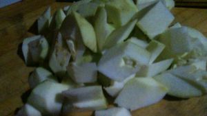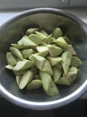 茄子去皮,切成滚刀块,切法就是,切一块茄子转一下。大点切,茄子一炒就缩小了。切完后,用盐拌匀腌一会,去去茄子里的水,好熟。