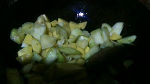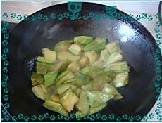 土豆先炸,用五成热的油,我分析五成热就是要冒青烟还没有冒的时候。炸的时候火不要太大,让土豆外表稍稍焦色,里面还要熟。炸完土豆,油稍降温就炸茄子,也是外表焦色,茄子炸之前要攥水。最后炸青椒,青椒在热油里就炸不到一分钟,青椒外表有点起泡,就可以了。