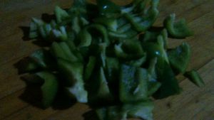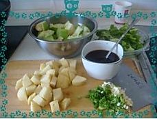 土豆切滚刀块,茄子切稍大点(我都是用手撕的,我觉得撕的比切的好吃),青椒撕片。茄子切好后用盐煞下水分。 调汁:蚝油、老抽、料酒、鸡精、盐、少量醋、少量糖、淀粉及水调成汁(这步我没有放盐,我家不喜欢吃咸的,因为煞茄子已经放盐了,这里就不放了)。葱姜蒜切末待用。