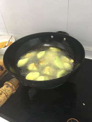 将土豆,茄子,长豆角分别入锅油炸,然后盛出控下油