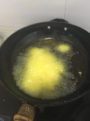 锅烧热,放油,70度左右放土豆,炸至表皮金黄后捞出。