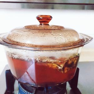 将汤汁滤出后,再加100g红糖,加清水同上述方法一样慢炖出汤汁