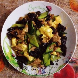 锅加油烧热,加入肉片翻炒至肉变白,加入葱姜继续翻炒至肉熟,加入木耳和黄瓜继续翻炒,期间可以加入少量水淀粉、五香粉和酱油,翻炒至有黄瓜的清香即可,加入少量盐调味出锅