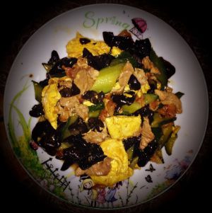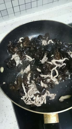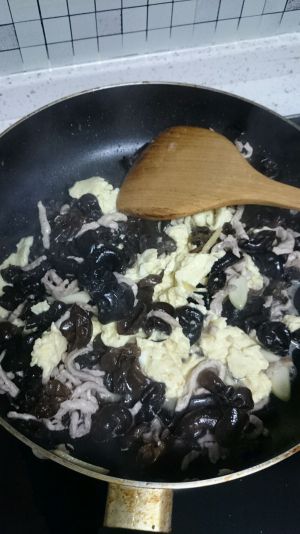鸡蛋提前炒一下盛起来备用,然后下姜蒜下肉丝炒至变色,下木耳