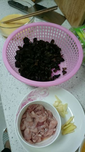 所有食材备好,木耳泡发,猪肉提前料酒和盐腌制去腥,鸡蛋打散(可以适量加点水,炒起来会嫩)