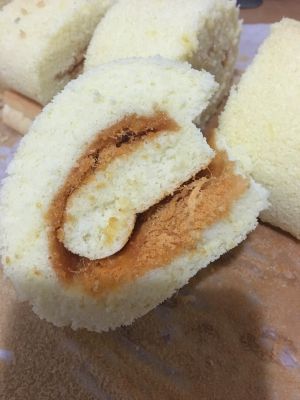 待温热后重新拿张油纸盖上,同时拿起两张油纸一侧翻过来,切除上下两边(此步骤忘记拍图了,下次补上)我是借助擀面杖,开头先压一压,这个卷起没有空心,比较饱满