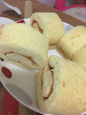 稍凉后,在一侧切出1.5厘米宽的刀痕,不要切断,用擀面杖助卷(卷蛋糕的视频网上有很多,可以提前观看一下)定型2分钟切盘