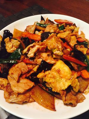 锅中放少量油,油热后加入小葱爆香,将木耳、黄瓜、胡萝卜放入锅中煸炒,加入生抽、老抽(喜欢颜色深的可放点),炒到断生后加入鸡蛋和肉,放入盐和鸡精,翻炒几次后加入香油即可出锅。