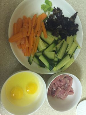 将木耳提前泡发,黄瓜和胡萝卜洗净切片,鸡蛋打散,猪肉切片加淀粉和料酒腌制,小葱切小块备用。