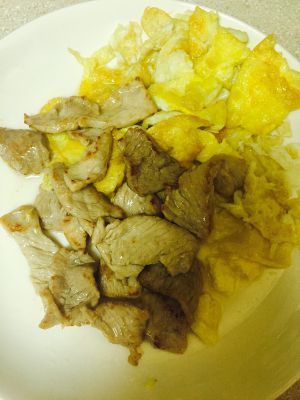 锅中放锅,油热后放入打散的鸡蛋,鸡蛋成饼后,用锅铲成大块,盛出。锅中留油,油热后将肉片放入锅中煸炒,加入少许白醋(1,2滴即可),千万别放多,肉炒到全部变色后盛出备用。