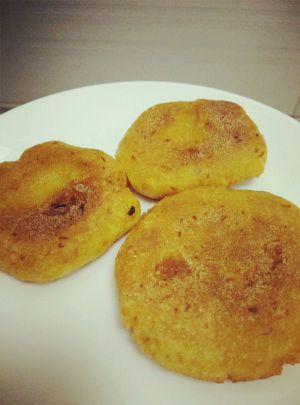 揉成小圆,然后压平,放在锅里煎一会儿,要小心糊掉