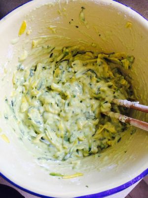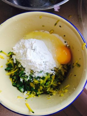 在南瓜丝中加入葱花,盐,鸡精,面粉,打入一颗鸡蛋