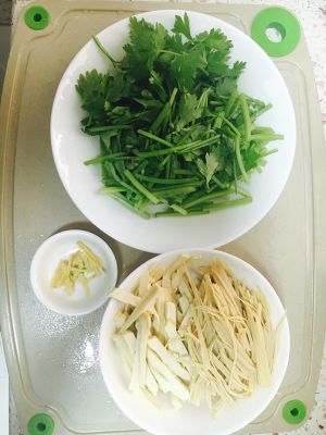 食材准备,芹菜去根洗净切段装盘,叶子可根据个人喜好保留、香干或者千张切丝、生姜一片切丝。备用。