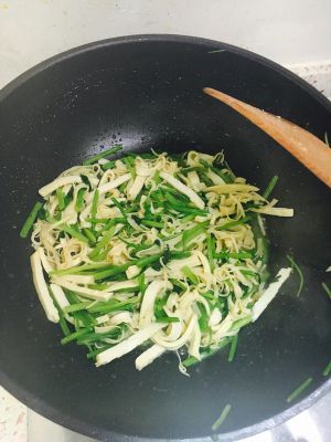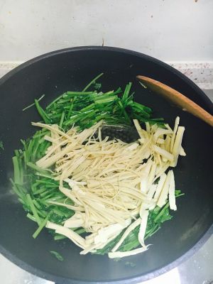 油热后放入香干煸炒,炒出豆香味, 这种香干是熏制的,带着特殊的熏香味,比白豆干好吃。