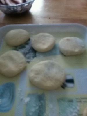 开始制作了,将面团压成一个圆形,里面放一点豆沙馅,再包成一个圆球,压扁,我买的现成的豆沙馅,没有自己做