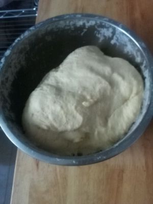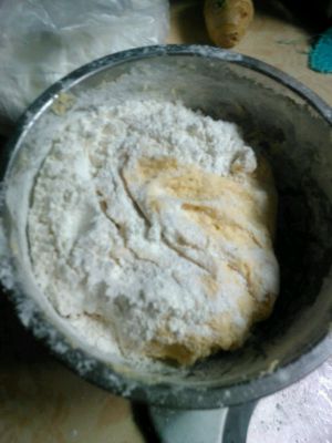 把蒸熟的南瓜压成泥,凉成温热与姜糖,粉类,盐,油搅拌均匀。