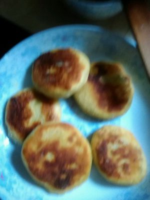 最后一步,平底锅放适量花生油,慢火,把南瓜饼放入锅内稍等有饼变黄色再翻另一面,注意动作要轻