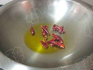 锅内倒少量油,加热至七成热时,下干辣椒爆香。