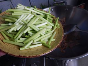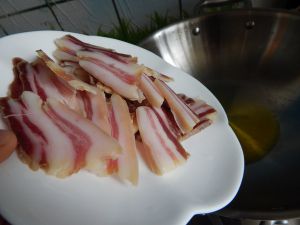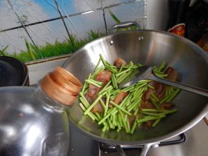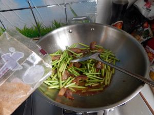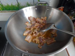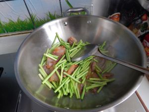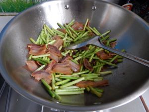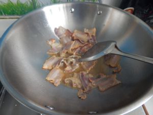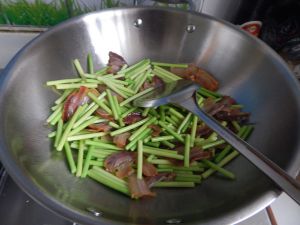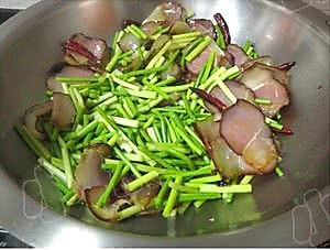 放入腊肉片,翻炒均匀,当肥内部分都变透明后,下蒜苔段。