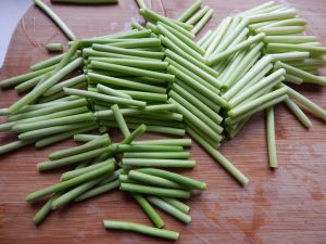 把切好的蒜台放入锅内过一下,这样蒜台就能入味了。