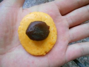 接着把南瓜面团揉成长条,揪下一小块搓圆压成小圆饼,再包入一小块豆沙馅。豆沙馅自己做麻烦,超市有买现成的。