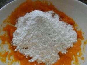 南瓜蒸熟之后和糯米粉和在一起。加糖。可以尝下甜度。根据自己喜好甜度,不够再加。