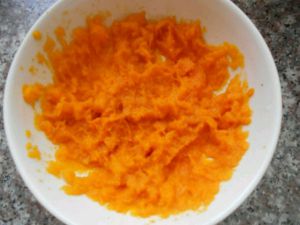 加热后的南瓜变软,此时趁热压成南瓜泥,再加入一至两勺白糖继续辗压