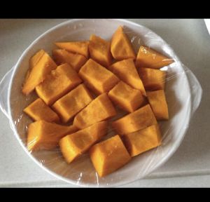 南瓜切小块放到碗里,保鲜膜封上直接放到微波炉加热8分钟至熟,