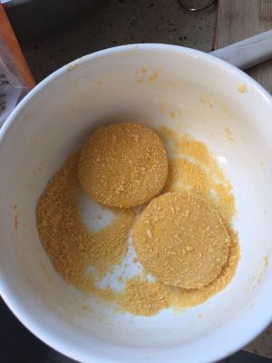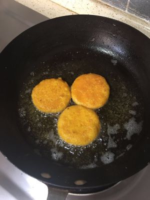 锅里油烧八成热,把粘好面包糠的南瓜饼放进去炸,炸至金黄即可。