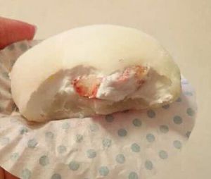 第五部分:打发奶油加适量细糖粉,喜欢甜的可以多加点糖粉,在面皮上涂上奶油,再加自己喜欢的水果,再加点奶油,最后用包包子的方法包好,放冰箱冷藏一会即可食用,