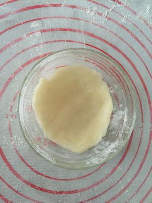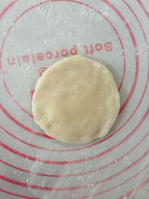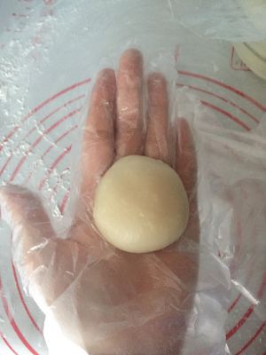 冷藏好了~案板上撒上炒好的糯米粉,取适量雪梅娘皮,按扁,或者用擀面棍擀开