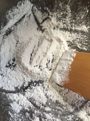 趁这蒸雪梅娘皮的时间,把糯米粉(2)倒入不沾锅内,小火慢慢炒至微微发黄,不能炒过头不然会发黄不好看了,放凉,黄油5克微波炉叮至融化备用