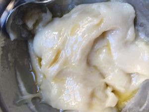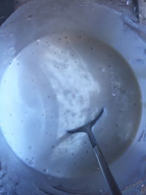 第二部分:将搅拌均匀的面浆放到蒸锅上蒸15分钟左右,蒸好后把溶化好的黄油加入搅拌均匀,等面团凉下,