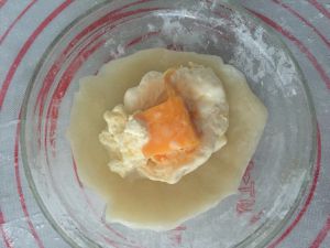 第四部分:面团凉了后,取适量炒好的手粉,双手心都插点免得手粘,将面团和手粉拍允,再取适量的面团放在手中压成圆形的用擀面杖擀成薄皮,
