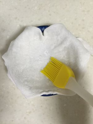 取一个小碗,先刷一刷雪梅娘皮上多余的粉,然后铺上。