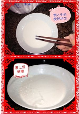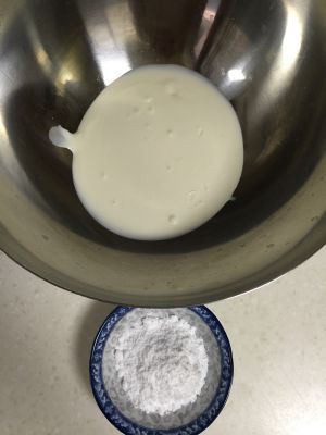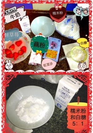 第一部分:先把30克糖粉和20克奶粉放到一个容器里倒入100毫升的温水,搅拌均匀到没有颗粒为止,在倒入100克糯米粉和30克玉米淀粉搅拌均匀