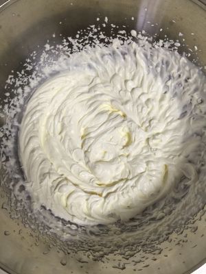 淡奶油加入糖粉和炼乳用打蛋器打至全发,备用。