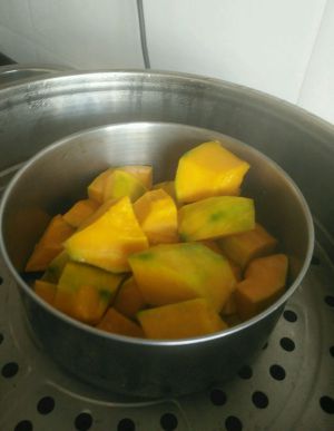 南瓜蒸熟压成南瓜泥 根据个人口味加糖 不加也可 南瓜还是蛮甜的 太甜对宝宝牙齿不好 我这里加了一勺