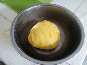 南瓜加白糖用勺子捣成泥,加上糯米粉,和成面团