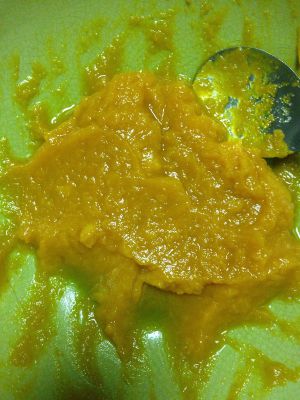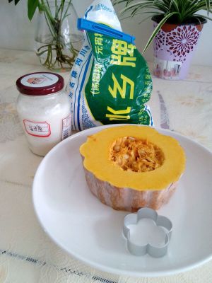 将南瓜去皮,切薄块,放入微波炉中微波高火5分钟。取出晾凉一点,捣碎,成泥。