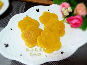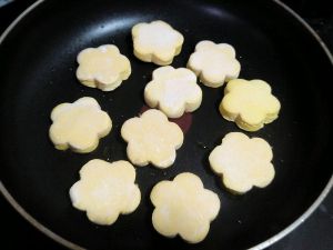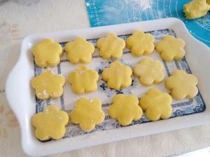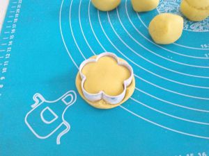 将面团搓成圆形,用手掌压扁,饼干模沾少许糯米粉,压在压饼的面团上,一朵花形南瓜饼胚就做好了