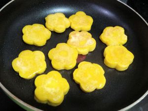 平底锅烧热刷一层油,放入花朵南瓜饼,中小火煎,直至南瓜饼可以晃动翻面。