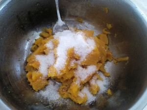 蒸熟的南瓜片放到盆里,趁热加入白糖,用勺子圧成泥备用