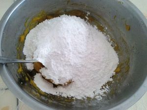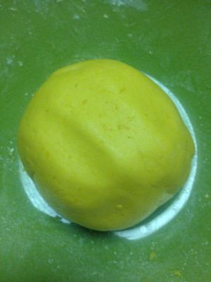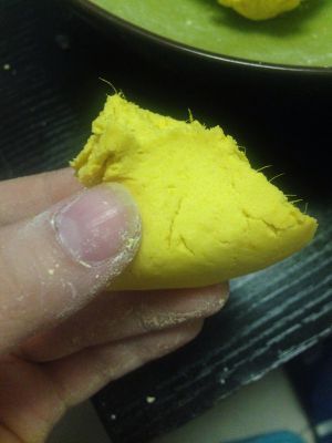 将糯米粉和白砂糖,一点一点揉入南瓜泥中,揉成面团。