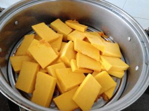 南瓜削皮洗净切片,放蒸锅蒸熟