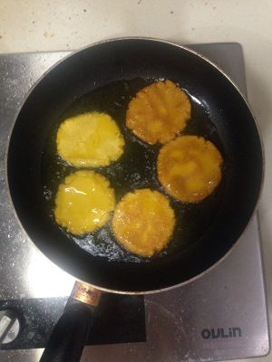 锅底放入食用油,小火,将南瓜饼两面煎透煎熟。