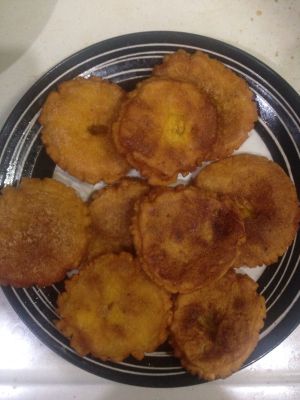 做好的南瓜饼表面可以沾点面包糠,不用也可以的。